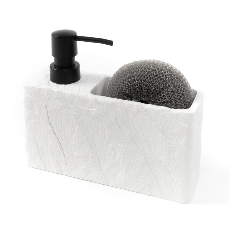 Dispensador de jabón con estropajo integrado y acabado pizarra en color blanco, de diseño práctico y funcional, ideal para mantener el fregadero limpio y organizado. Súper práctico, y perfecto para encajar en cualquier cocina.