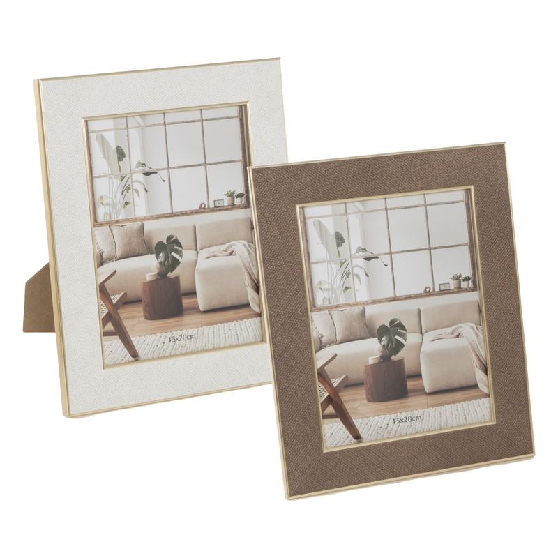 Portafotos para fotografías de 15×20 cm, fabricado en plástico y disponible en color blanco y marrón. Incorpora un filo decorativo color oro que aporta un acabado definido y discreto para enmarcar tus imágenes.