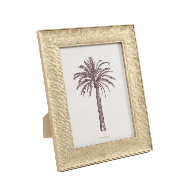 Portafotos para fotografías de 13×18 cm, fabricado en plástico en color dorado. Su marco con relieve aporta un acabado decorativo y llamativo, ideal para destacar imágenes con un toque luminoso.